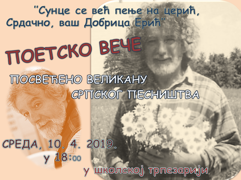 На вест да нас је напустио великан српског песништва Добрица Ерић, синоћ је у ОШ “Филип Филиповић“ одржано поетско вече под називом “Сунце се већ попело на церић, срдачно, ваш Добрица Ерић“.