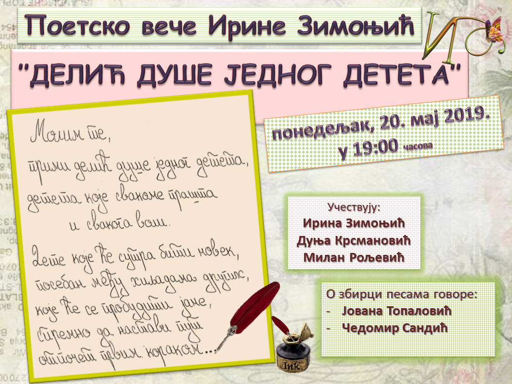 У нашој школи, 20. маја 2019. године одржано је поетско вече Ирине Зимоњић – “Делић душе једног детета“.
