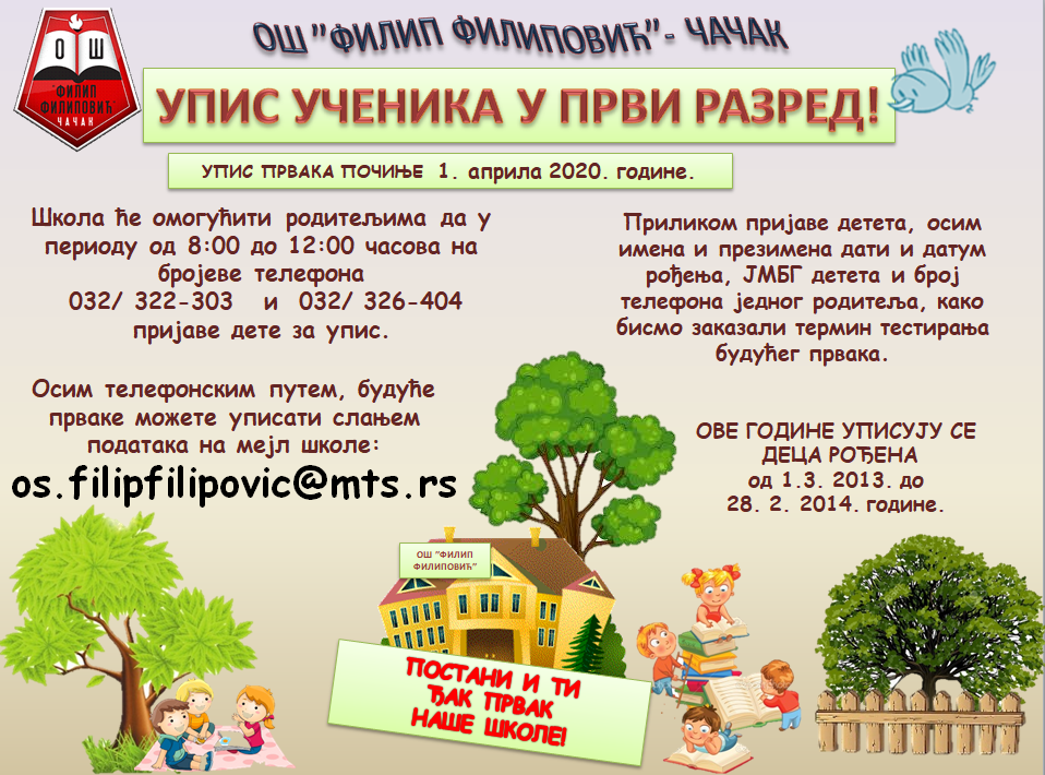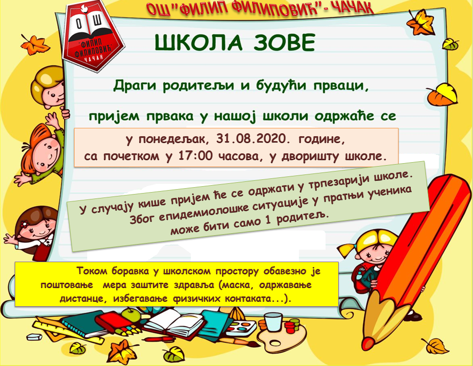 ВАЖНО ОБАВЕШТЕЊЕ! У уторак, 1. септембра 2020. године, у 16:00 часова, одржаће се пријем предшколаца у трпезарији школе.