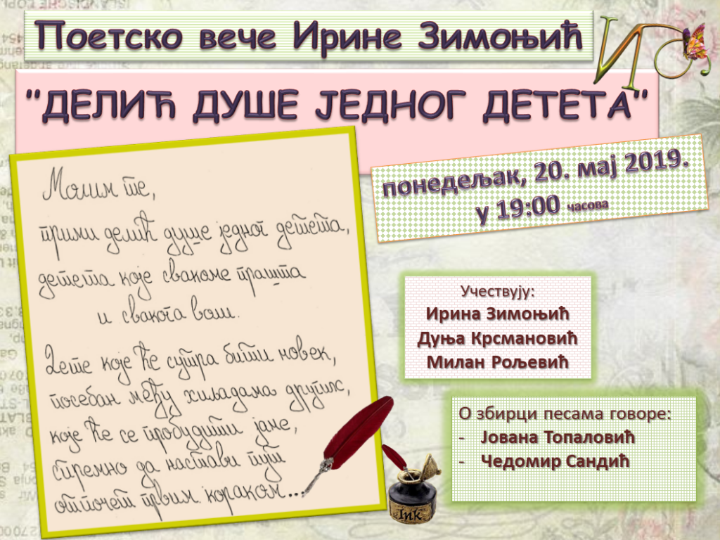 слике са дешавања У нашој школи, 20. маја 2019. године одржано је поетско вече Ирине Зимоњић – “Делић душе једног